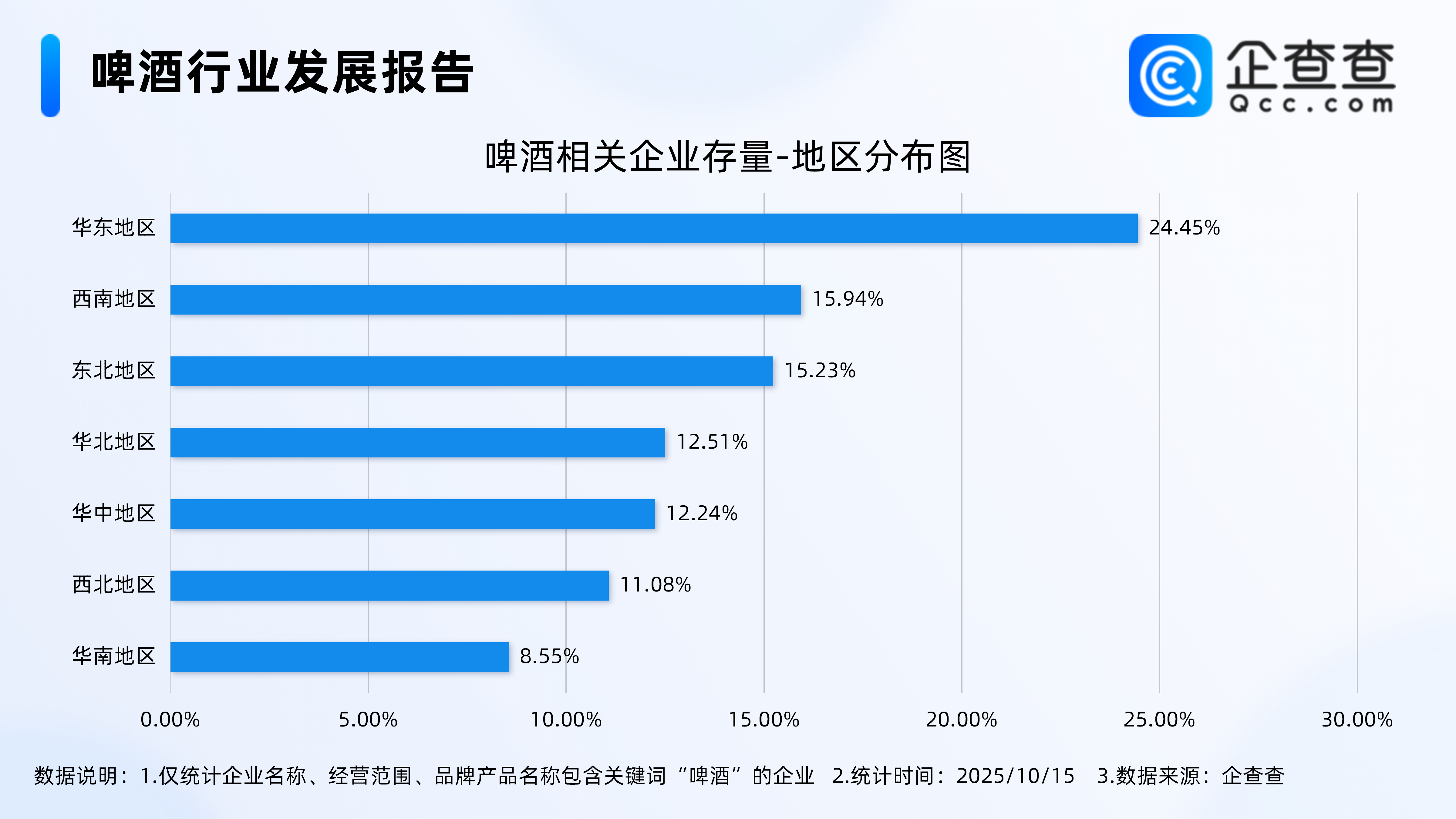 企查查数据显示,从地区分布来看,啤酒相关企业地区分布较为均匀,其中分布在华东地区的相关企业最多,占比24.45%。其次,分布在西南地区、东北地区的相关企业分别占比15.94%、15.23%。